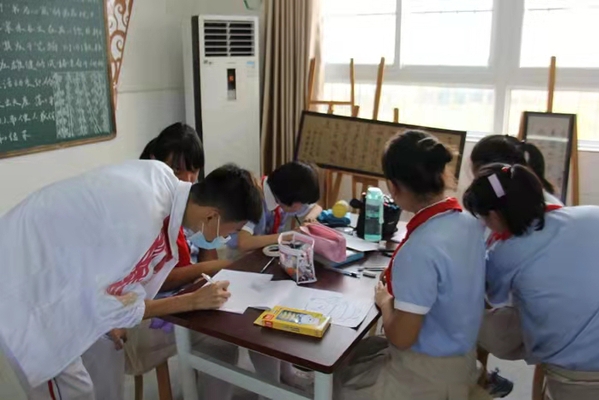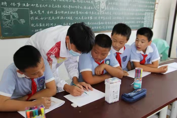 項目組一行在老峰鎮(zhèn)中心學(xué)校召開座談會,儲可可介紹了項目組成員、項目開展情況以及此次活動的方案、預(yù)期要達(dá)到的效果等。老峰鎮(zhèn)中心學(xué)校沈良順校長簡要介紹了老峰鎮(zhèn)中心學(xué)校校史、美術(shù)體育課程開設(shè)情況等。隨后,安慶職業(yè)技術(shù)學(xué)院藝術(shù)俱樂部部分優(yōu)秀學(xué)生深入課堂,給五、六年級學(xué)生開展繪畫、藝術(shù)體操等教學(xué)活動。