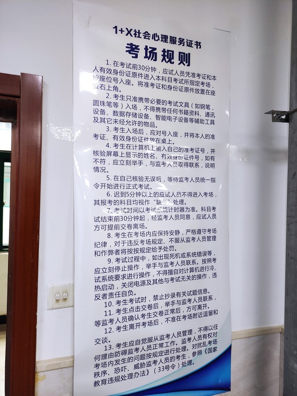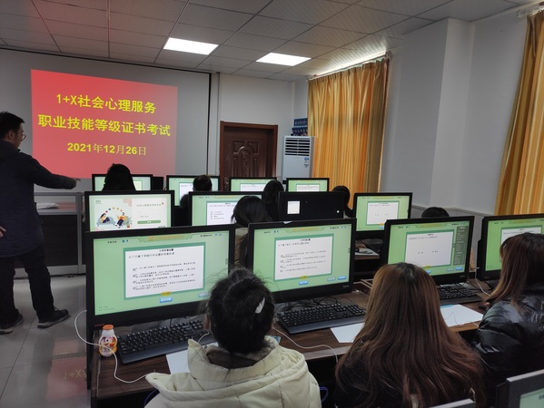 12月25日和12月26日下午,安慶職業(yè)技術(shù)學院管理服務學院“1+X”社會心理服務(中級)職業(yè)技能等級證書認證考試在圖文信息中心508、509機房順利舉行,2019級、2020級幼兒發(fā)展與健康管理專業(yè)共計100名同學參加了考試。考試期間,實訓中心李進恩主任、管理服務學院院長高潤霞、副院長楊厚松現(xiàn)場督導考務工作。