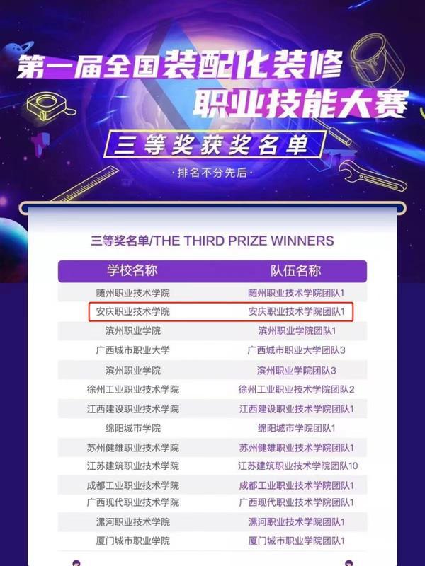 8月5日,第一屆全國裝配化裝修職業(yè)技能大賽——選拔賽如期舉辦,安慶職業(yè)技術(shù)學(xué)院建工學(xué)院建筑裝飾工程技術(shù)專業(yè)王慶成、夏高洋、許曉慧、耿琦偉四名學(xué)生參加了大賽,并喜獲全國三等獎。