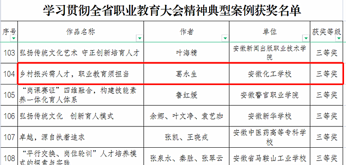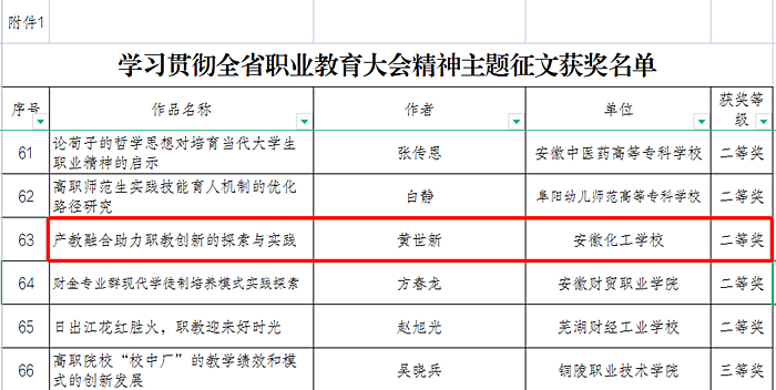 近日,在省教育廳下發(fā)的《安徽省教育廳關(guān)于公布學(xué)習(xí)貫徹全省職業(yè)教育大會精神主題征文、典型案例、先進(jìn)人物事跡征集活動獲獎作品的通知》中獲悉,安徽化工學(xué)校黃世新同志撰寫的主題征文《產(chǎn)教融合助力職教創(chuàng)新的探索與實踐》榮獲二等獎、葛永生同志撰寫的典型案例《鄉(xiāng)村振興需人才,職業(yè)教育須擔(dān)當(dāng)》榮獲三等獎。