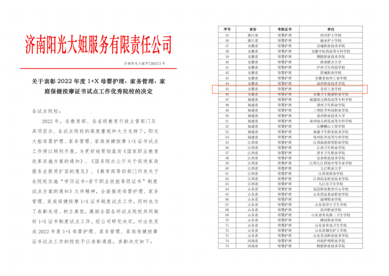 近日,安慶工業(yè)學(xué)校被教育部培訓(xùn)評(píng)價(jià)組織單位授予2022年度‘1+X’制度試點(diǎn)工作母嬰護(hù)理職業(yè)技能等級(jí)證書(shū)“優(yōu)秀試點(diǎn)院校”榮譽(yù)稱號(hào)。