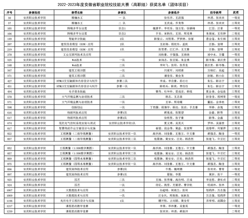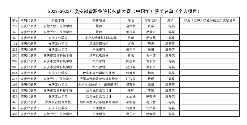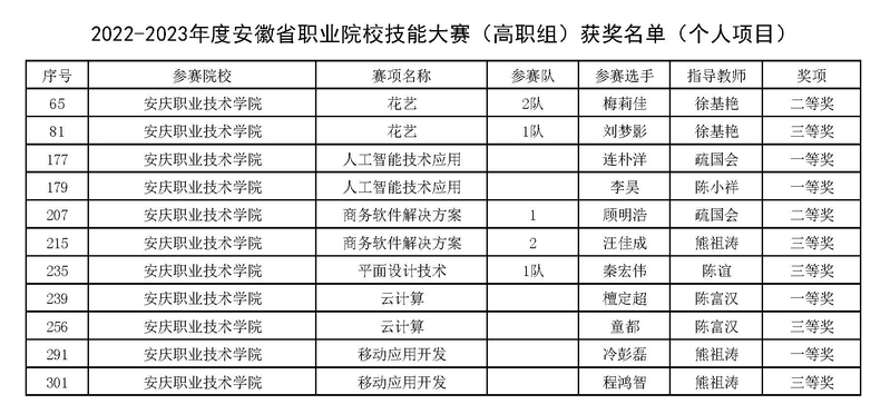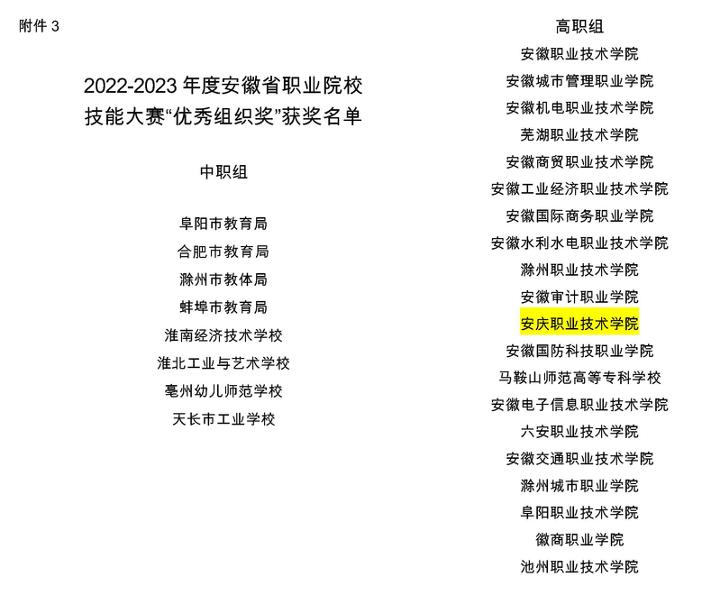 近日,安徽省教育廳、安徽省經(jīng)濟(jì)和信息化廳、安徽省人力資源和社會保障廳公布了2022-2023年度安徽省職業(yè)院校技能大賽獲獎名單,安慶職業(yè)技術(shù)學(xué)院和5所中職學(xué)校部分項(xiàng)目獲獎。