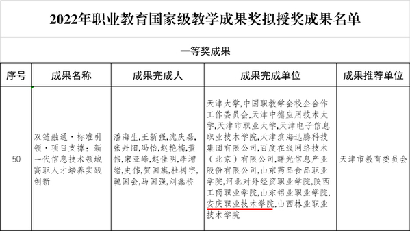 5月15日,教育部就評選出的2022年職業(yè)教育國家級教學成果獎擬授獎成果進行公示。安慶職業(yè)技術學院參與的“雙鏈融通·體系引領·項目支撐:新一代信息技術領域高職人才培養(yǎng)實踐創(chuàng)新”項目榮獲國家教學成果獎一等獎。該項目由天津大學牽頭,中國職教學會校企合作工作委員會指導,安慶職業(yè)技術學院、天津中德應用技術大學、天津市職業(yè)大學等九所職業(yè)本科和高職院校,天津濱海迅騰科技集團、百度在線網(wǎng)絡技術(北京)有限公司、曙光信息產(chǎn)業(yè)股份有限公司等三家企業(yè)共同參與,在制度建立、標準制定和創(chuàng)新實踐上進行了深度探索和應用,取得了一系列高質量理論和實踐成果。