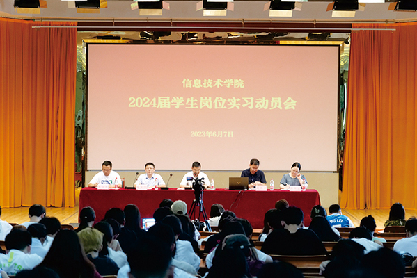 為落實(shí)學(xué)校關(guān)于畢業(yè)生崗位實(shí)習(xí)管理規(guī)定,強(qiáng)化實(shí)習(xí)管理,確保實(shí)習(xí)質(zhì)量,6月7日下午,安慶職業(yè)技術(shù)學(xué)院信息技術(shù)學(xué)院2024屆畢業(yè)生崗位實(shí)習(xí)動員暨就業(yè)招聘會隆重舉行。主會場設(shè)在圖文信息中心一樓報(bào)告廳,二號教學(xué)樓216報(bào)告廳、各智慧教室設(shè)分會場,學(xué)生通過網(wǎng)絡(luò)直播同步收看。信息技術(shù)學(xué)院內(nèi)設(shè)機(jī)構(gòu)負(fù)責(zé)人、專業(yè)建設(shè)負(fù)責(zé)人、相關(guān)輔導(dǎo)員及2024屆927名畢業(yè)生參加了動員會。該院黨總支書記、院長疏國會出席會議并講話,黨總支副書記陳富漢參加會議,副院長熊祖濤主持會議。