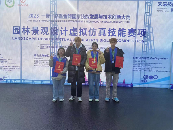 11月11日,2023 一帶一路暨金磚國家技能發(fā)展與技術(shù)創(chuàng)新大賽“園林景觀設(shè)計(jì)虛擬仿真技能賽項(xiàng)”在河南農(nóng)業(yè)職業(yè)技術(shù)學(xué)院舉行,來自全國28個(gè)省、市、自治區(qū)193支隊(duì)伍參加了此次比賽。經(jīng)過一整天的緊張比拼,經(jīng)安慶職業(yè)技術(shù)學(xué)院農(nóng)林與服裝學(xué)院唐長貞老師、哈滿林、葛尹睿三位老師指導(dǎo),由22園林技術(shù)班張成瑜、劉子翔組成的2隊(duì)和張晨晨、張永樂組成的1隊(duì)分別獲得二等獎和三等獎。