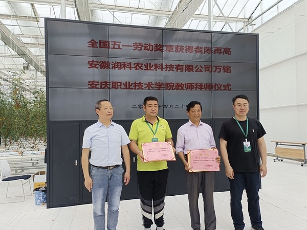 為深入推進(jìn)教師隊(duì)伍建設(shè)工作,創(chuàng)新“師帶徒”方式,安慶職業(yè)技術(shù)學(xué)院農(nóng)林與服裝學(xué)院組織開展“名師導(dǎo)師帶徒”工作。4月24日,農(nóng)林與服裝學(xué)院黨總支書、院長李進(jìn)恩帶領(lǐng)植物保護(hù)與檢疫和園藝技術(shù)專業(yè)團(tuán)隊(duì)教師在安徽潤科農(nóng)業(yè)科技有限公司向全國五一勞動(dòng)獎(jiǎng)?wù)芦@得者陳再高和安徽潤科農(nóng)業(yè)科技有限公司副總經(jīng)理萬銘拜師。