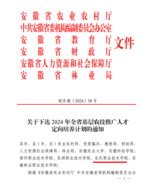 近日,安徽省農(nóng)業(yè)農(nóng)村廳等六部門聯(lián)合印發(fā)《關(guān)于下達 2024 年全省基層農(nóng)技推廣人才定向培養(yǎng)計劃的通知》,安慶職業(yè)技術(shù)學(xué)院被定為安徽省基層農(nóng)技推廣人才定向培養(yǎng)高校。