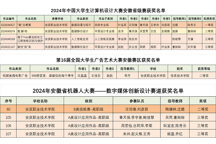 在安徽省教育廳公布的《關(guān)于公布2024年7月至8月安徽省大學(xué)生學(xué)科和技能競賽部分賽事獲獎(jiǎng)名單的通知》中,安慶職院沈璐、陳秀云老師指導(dǎo)的葉運(yùn)來、汪仰烽、魯天保、王夢(mèng)帥、劉彥君學(xué)生團(tuán)隊(duì)獲得2024年中國大學(xué)生計(jì)算機(jī)設(shè)計(jì)大賽安徽省級(jí)賽“數(shù)媒動(dòng)漫與短片類-動(dòng)畫專業(yè)組”一等獎(jiǎng);施展、董辯辯老師指導(dǎo)的余洋、魯天保、吳莟雪、王佼、史朝霖學(xué)生團(tuán)隊(duì)獲得“數(shù)媒靜態(tài)設(shè)計(jì)類-平面設(shè)計(jì)專業(yè)組”二等獎(jiǎng);陳曉慧、方驥、董辯辯、劉文倩老師指導(dǎo)的學(xué)生團(tuán)隊(duì)分別獲得“人工智能應(yīng)用類-人工智能實(shí)踐賽”和“數(shù)媒靜態(tài)設(shè)計(jì)類-平面設(shè)計(jì)專業(yè)組”三等獎(jiǎng)。在第16屆全國大學(xué)生廣告藝術(shù)大賽安徽賽中,李丹老師指導(dǎo)的汪晶晶、王佳樂、趙航學(xué)生團(tuán)隊(duì)獲得“視頻類微電影廣告”二等獎(jiǎng)。