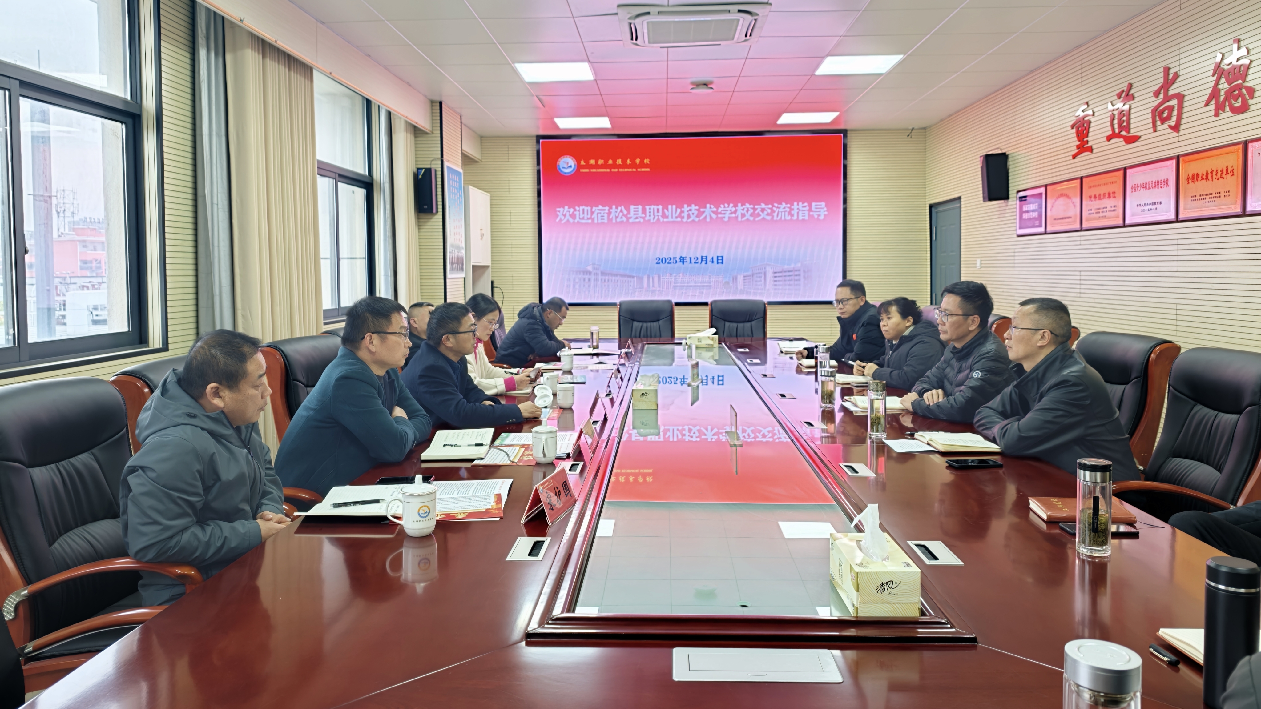 12月4日,宿松縣職業(yè)技術(shù)學(xué)校黨支部書(shū)記、校長(zhǎng)鄧勝榮率領(lǐng)調(diào)研團(tuán)隊(duì)一行6人來(lái)訪我校,圍繞專業(yè)建設(shè)、辦學(xué)層次提升、教學(xué)管理、校企合作等核心議題開(kāi)展專題調(diào)研交流。我校班子成員及相關(guān)職能部門(mén)負(fù)責(zé)人參與接待,雙方通過(guò)座談研討與實(shí)地參觀,展開(kāi)深入交流,凝聚發(fā)展共識(shí)。